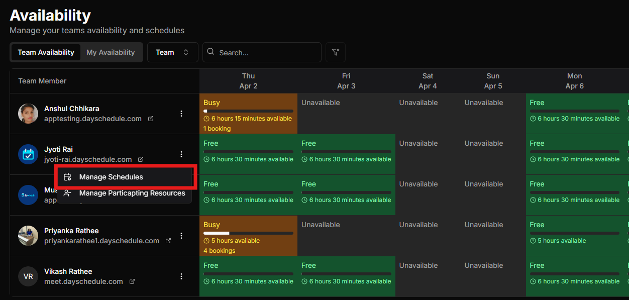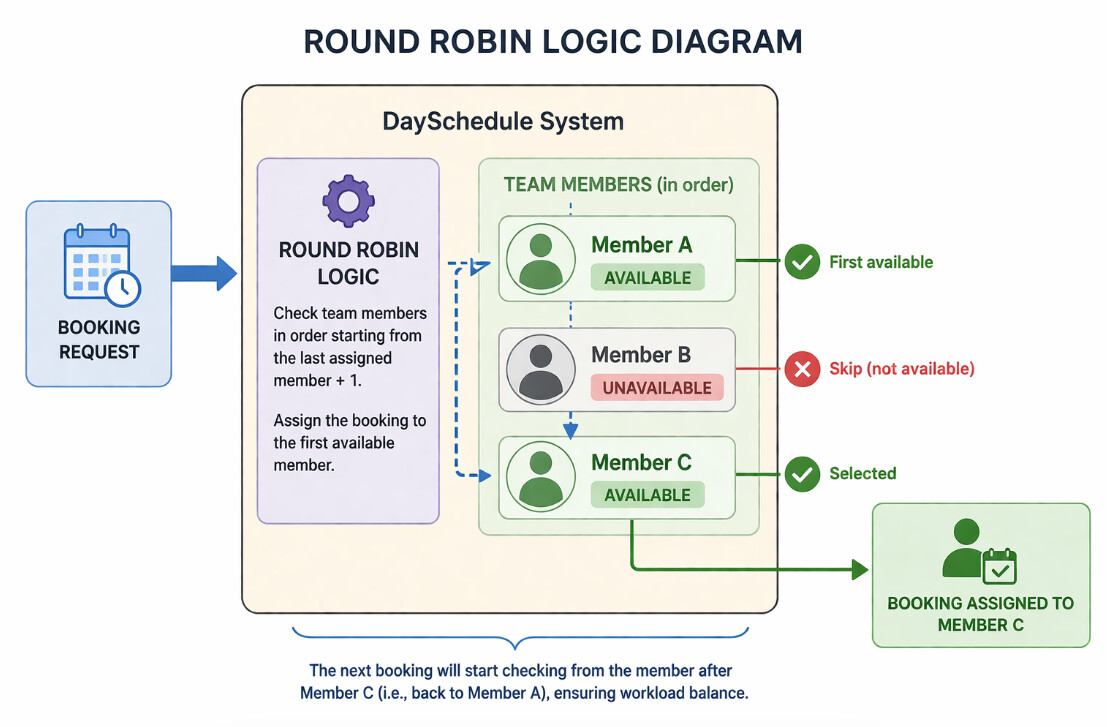 DaySchedule automatically picks the available staff for the selected time slot and assigns the booking. When a customer visits your booking page and selects a time, the system checks the availability of all team members included in the round robin event. It then identifies who is free and confirms the appointment with that specific member immediately.