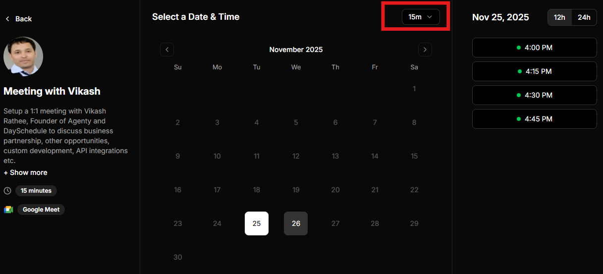 DaySchedule automatically detects the invitee’s time zone when someone opens your appointment link regardless of their country or region. The system then converts and displays all available time slots in the invitee’s local time zone to avoid time confusion.