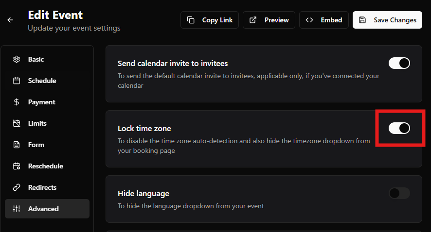 However, in some cases, you may want to lock the time zone so that invitees always view your time slots, webinar timing in a fixed time zone. For example, if you’re hosting an event in a specific region or want everyone to book based on your business time only.